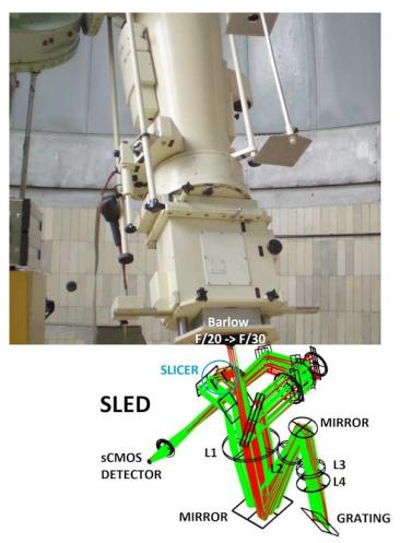 Cet instrument est développé par Paris, Wrocław (Pologne) et Belfast (UK). Il est décrit dans les articles « Four decades of advances from MSDP to S4I and SLED imaging spectrometers » (Mein et al, 2021, déjà cité) et « The Solar Line Emission Dopplerometer project » (Malherbe et al, 2021, ci-dessous). C’est une version compacte de S4I, avec éclateur monobloc pour éviter les inégalités des bords de micro-miroirs. Il a été défini par F. Sayède pour une spectro-imagerie rapide dans les raies coronales FeXIV 5302 et FeX 6374 Å, avec 24 canaux dans chaque raie. Il est prévu transportable pour des observations d’éclipses. En dehors des éclipses, des adaptations de SLED sont prévues sur le coronographe de Lomnicky et sur celui de Bialkow, avec la possibilité d’observer les raies des protubérances.