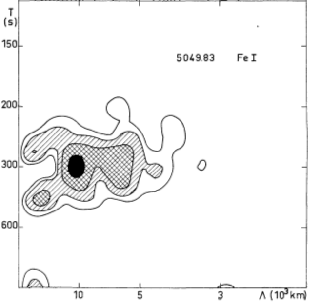 Droite : Spectre de puissance dans le même diagramme pour les vitesses observées dans une raie photosphérique (Ondes stationnaires vers les périodes de 300s).